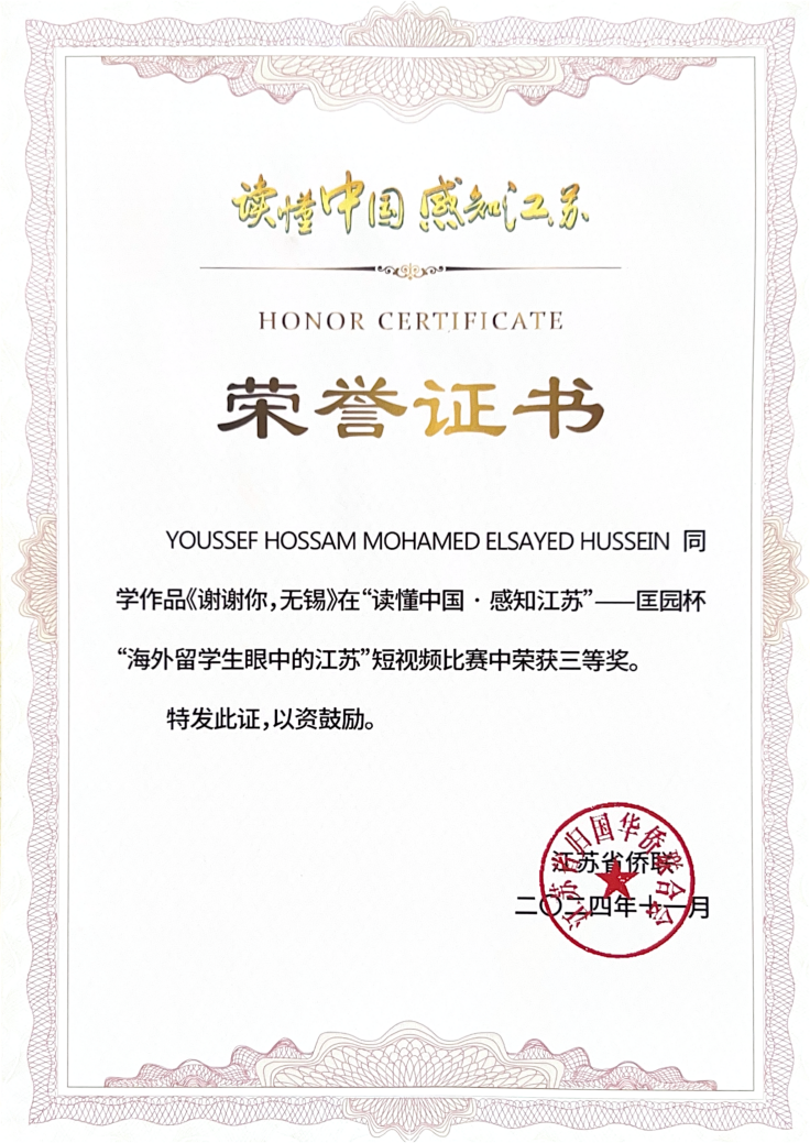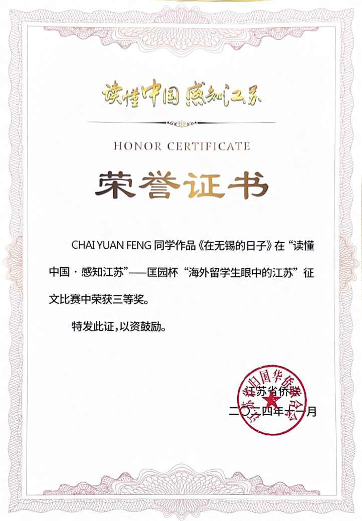 无锡学院的留学生们能在众多参赛者中取得优异成绩,充分展现了他们对江苏的深刻理解和热爱。这些作品也是他们在江苏学习生活的真实写照,体现了他们对中国式现代化的真切感悟。无锡学院国际教育学院将立足学校特色,结合自身办学优势,鼓励更多留学生在学习之余参与各类高质量竞赛,进一步提高来华留学生人才培养质量和国际化办学水平。(国际教育学院/文:薛凡蕾;图:国际教育学院;审核:王勇)