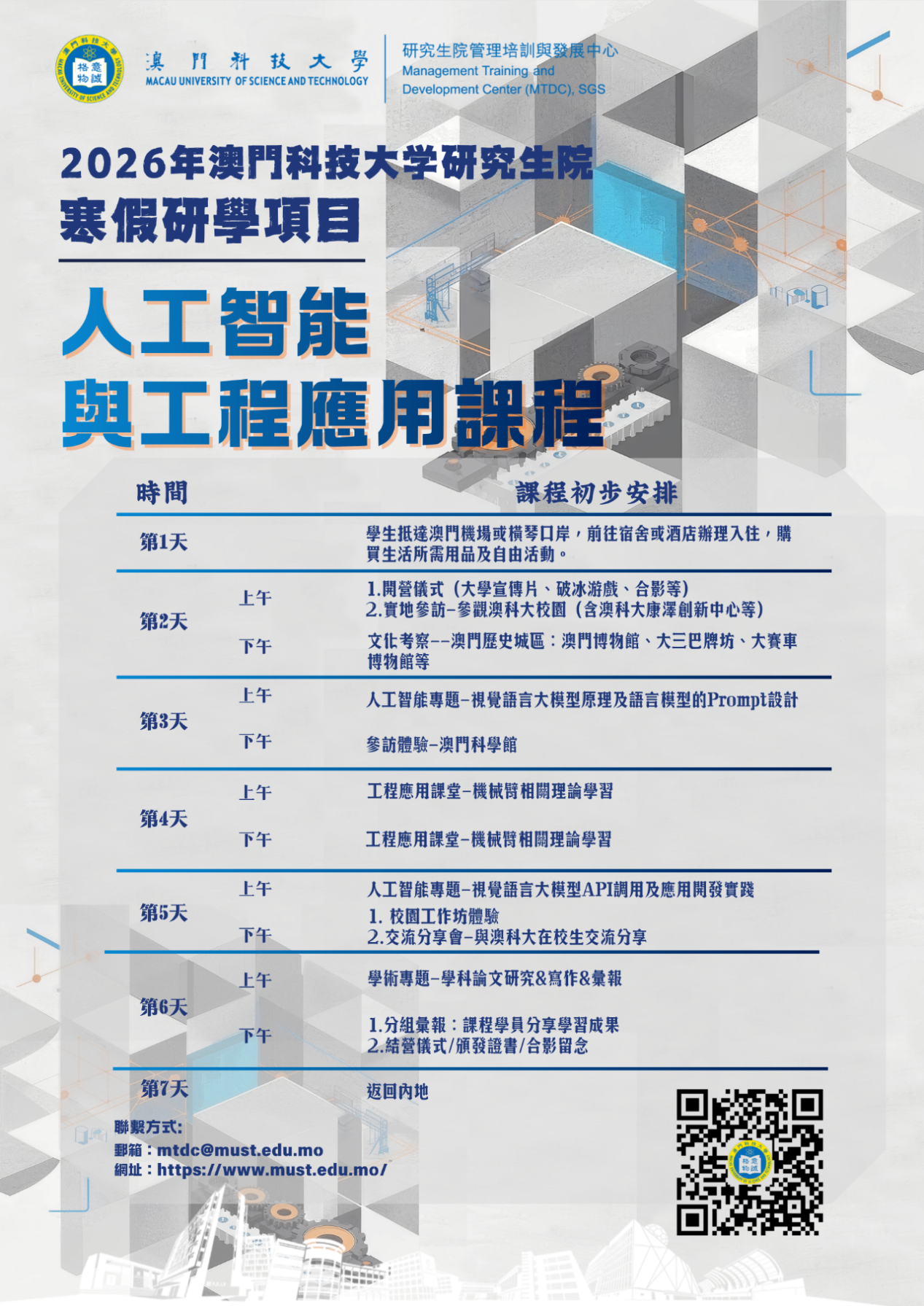 基于我校与澳门科技大学的合作交流协议,我校开通澳门科技大学研究生院2026年寒假研学项目,现将有关事项通知如下: