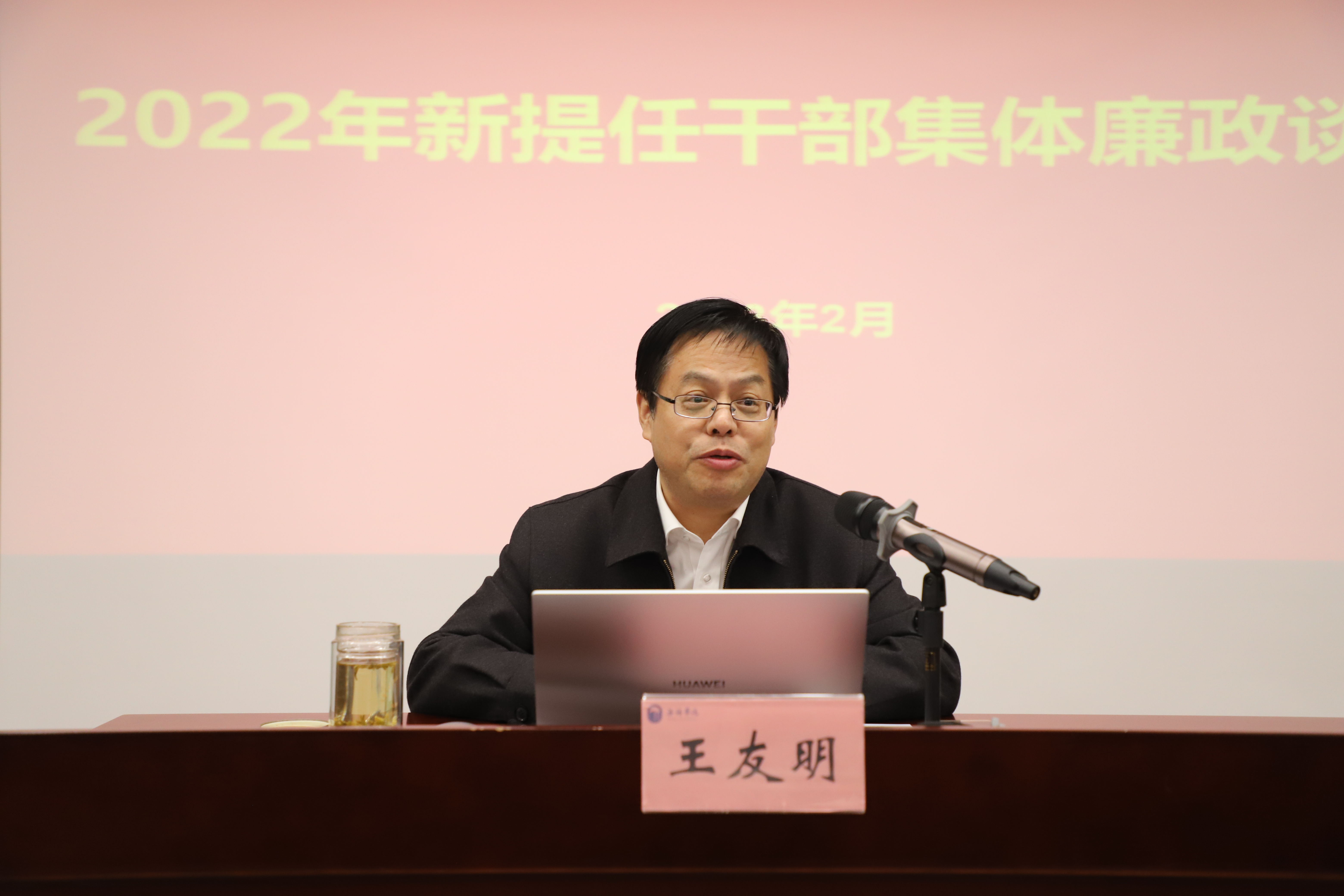 为贯彻落实全面从严治党要求,加强干部教育、管理和监督,促进我校干部廉洁自律、忠诚履职尽责,2月15日下午,校纪委书记王友明对2022年新提任干部开展集体廉政谈话。我校新提任干部60余人参加谈话。