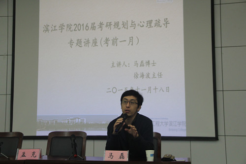 考研愈发临近,是不是时常感觉“压力山大”,焦虑不安?是不是书上的内容总感觉看不完,总会有不会做的题,感觉还有很多东西没背?是不是看到同学们都去找工作了感觉自己坐不住了?为帮助考研同学们更好地规划最后一段时间的复习,以最佳的心理状态走进考场,11月18日晚,滨江学院特邀浙江大学博士、信大卓越考研指导名师、“名校考研俱乐部”策划人、考研辅导、激励与规划专家马磊副教授以及南京信息工程大学心理中心主任徐海波老师,为2016届考研学子作“考前一月考研规划与心理疏导”专题讲座。