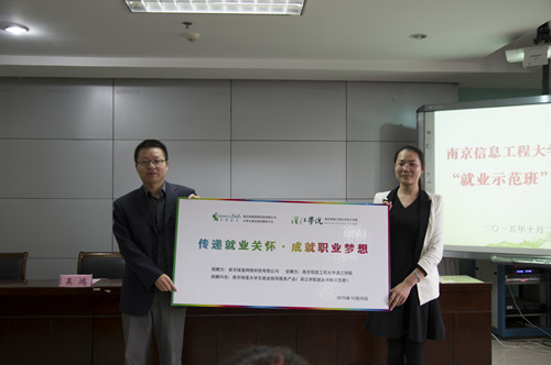 王静是我院2012届学生,两年前创业成立了专为大学生就业服务的南京绿莲公司,该公司是2014年和2015年南京市人社局就业指导校园行唯一承办单位,近两年为南京60多家高校组织近400场的就业指导活动。为回报母校培养之恩,王静捐赠滨江就业示范班。