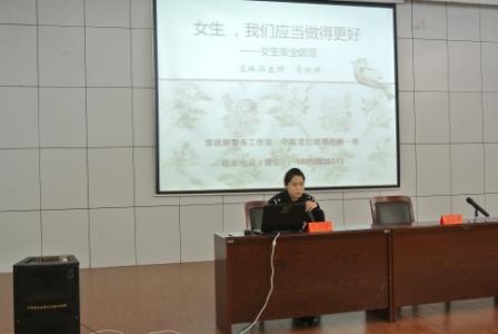 常警官从“女生如何保护自己”、“女生的恋爱问题”、“女生如何培养自己”、“女生如何做得更好”四个方面为女大学生支招。讲座一开始,常警官从现实案例入手,教导女生注意人身安全和财务安全。例如,远离黑车、选择正规交通工具、记下车牌号等乘车注意事项;结伴而行、慎交网友、衣着不过分暴露等自我保护原则;切忌贪占小便宜而陷入网络购物诈骗;切忌兼职心切而掉进“代刷信誉度 轻松赚大钱”的陷阱。结合自身成长经历,常警官呼吁大家树立正确的恋爱观,她说,谈恋爱的最佳时间是大三到大四;在恋爱问题上单项选择绝对是错误的、多项选择会让女生得到完美的爱情。常警官还提醒女大学生们要摆正心态、增强自信、强化学业修炼,在大学期间孕育自己高尚的道德情操和完美的人格魅力,在“自尊 自爱 自强 自立”中做更好的自己。