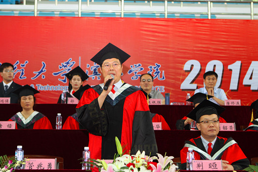 学院电子系主任张银胜副教授作为教师代表发言。大学四年生活是辉煌而短暂的人生驿站,毕业了,其实又开学了,同学们将进入一所叫“社会”的无形大学。在那里没有补考只有淘汰,需要同学们在那里,用几年、甚至几十年的时间,去慢慢完成答卷,让社会对同学们进行评判。在离别之际,赠送滨江学子两句话。有志在千里的理想,有一心一意的态度,更要有百折不挠的意志。