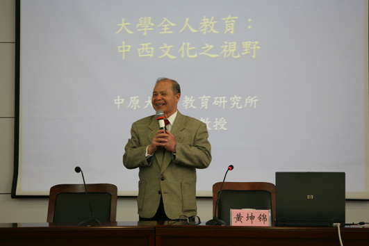 黄坤锦教授从分析目前中西方大学所表现出的“功利导向、就业导向”的教育现状出发,阐述了全人教育的现代价值及主要内容。黄教授以“民族文化的代表”——文字作为切入点,从《易经》的引经据典中,对“五行”的逐个分析中,黄教授解读了简单的中文汉字中所蕴含的深厚文化。黄教授说,沟通“天、地、人”三者,方是中国古代知识分子们所追求的最高境界。黄教授强调,以人为本,培养完整的、全面发展的人,使受教育者在人格与学问、理智与情感、身与心各方面得到自由、和谐、全面的发展,并能够在自身和谐的基础上寻求与他人、社会和自然的和谐共存;人除了外在形体(如身高、容貌等),更应该注重内在品质(如智慧、情感、创造力、想象力、怜悯心、好奇心、尊重感、自我实现的期望等)。这正是全人教育的深刻内涵。黄教授还结合台湾中原大学的实际情况,从神学、人文科学、社会科学、自然科学四个层面阐述全人教育的实施,呼吁全人教育需要在“中西文化的融合、人文科技的整合”中得以实现。