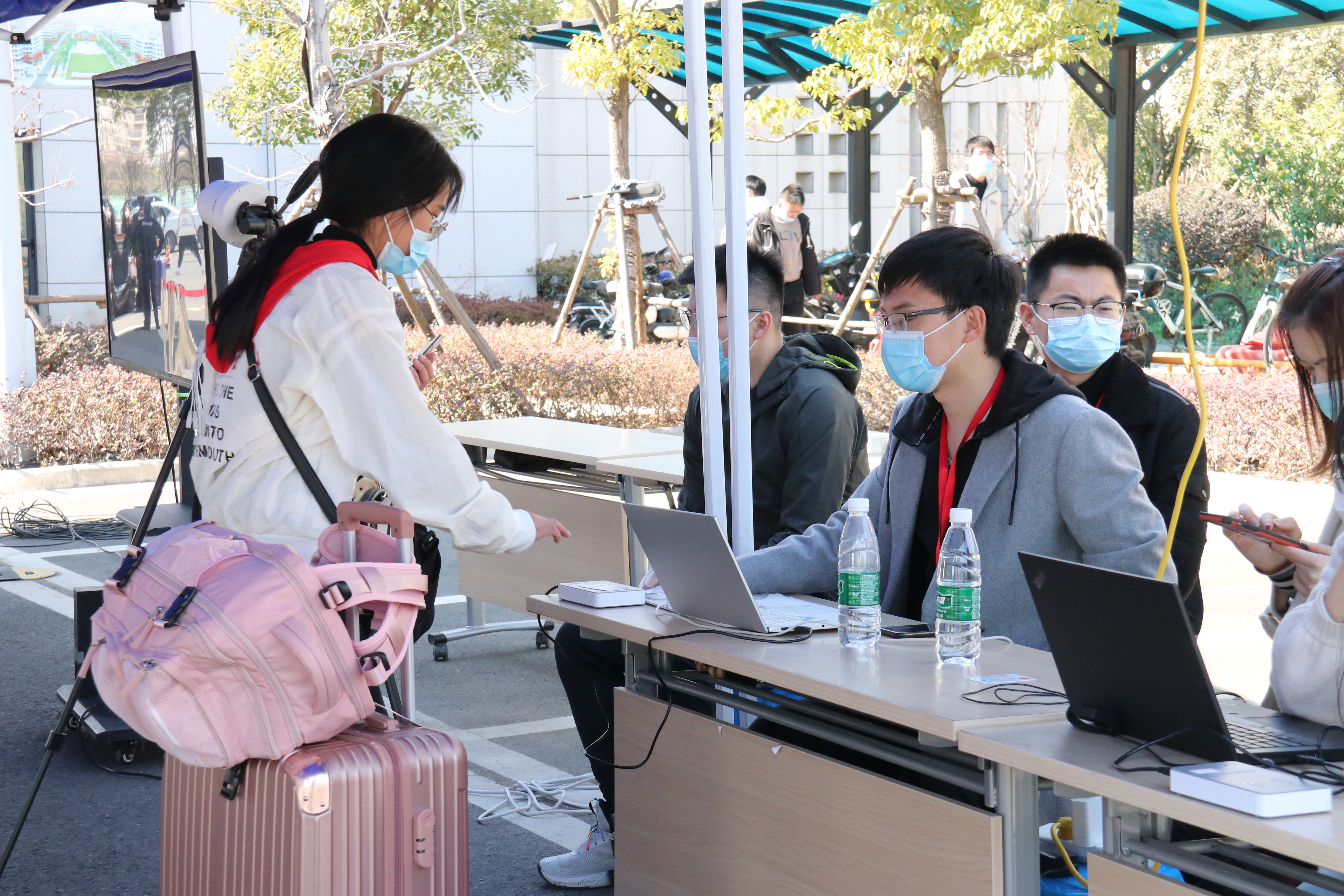 根据安排,返校学生以学院为单位进行分批分时报到。早上7点半,报到工作组的老师、志愿者和安保人员便在西门报到处准备就绪。每当有学生拎着行李箱到达西门,志愿者会引导他们分别在桃园通道入口、李园通道入口间隔一米有序排队,提醒他们提前准备好身份证、苏康码和超星学习通上的入校资格审批结果等材料进行核验。待老师核验完毕后,学子们会进入电子测温仪区进行体温测量。随着屏幕上“体温正常”的绿框一次次闪现,同学们快速通过,进入校园。报到现场也设置了学生党员示范岗,他们帮助学生搬运行李,进行核对返校审批等操作,充分发挥了党员的先锋模范作用。因为行程原因,有的学生到校已是深夜和凌晨,学院也安排了值班人员24小时待命,为学生顺利入校保驾护航。