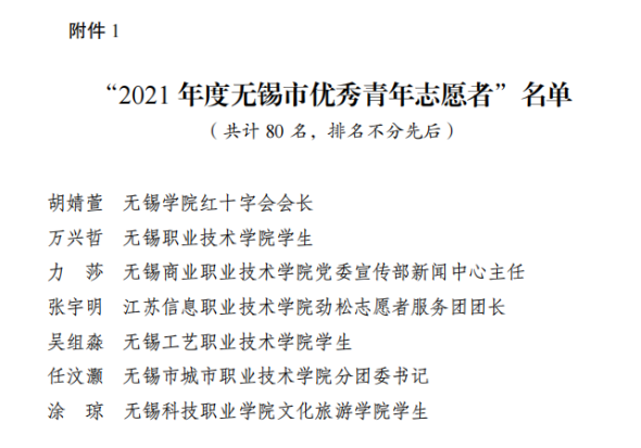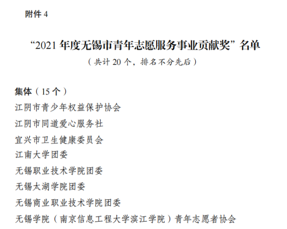 近日,2021年度无锡市志愿服务工作表彰名单公布,我校青年志愿者协会获评“2021年度无锡市青年志愿服务事业贡献奖”,胡婧萱同学被评为“2021年度无锡市优秀青年志愿者”。