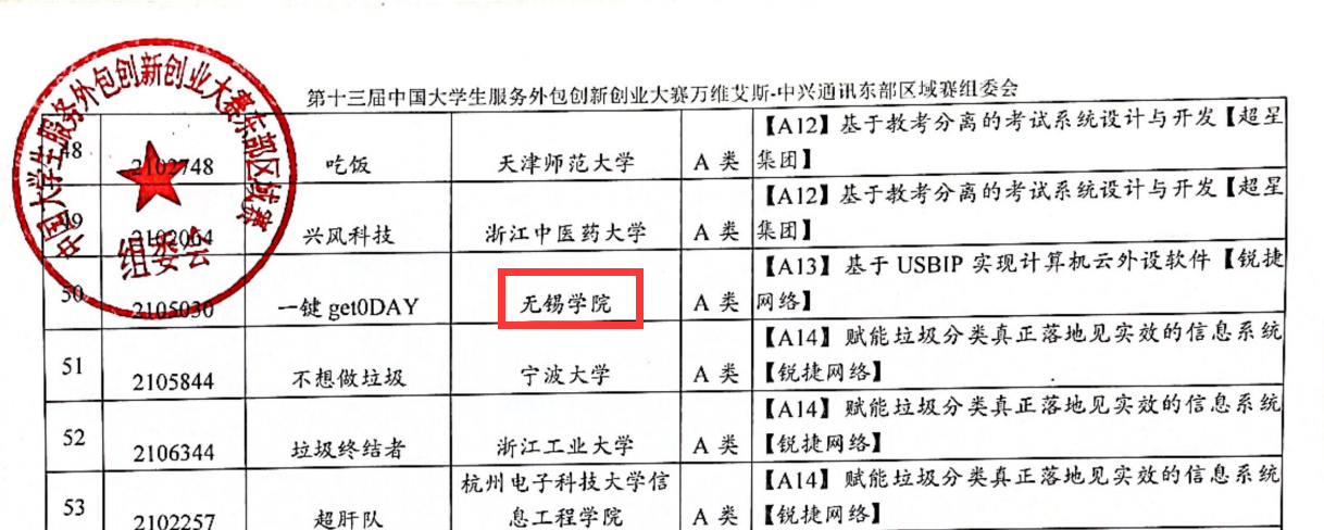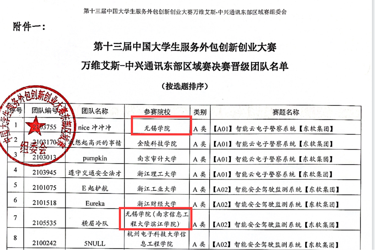 近日,第十三届中国大学生服务外包创新创业大赛东部区域赛线上评审已顺利结束,我校参赛队伍喜获佳绩,共有三支队伍晋级东部区域赛决赛,分别是来自孙家栋、李富、孙宁和毛伟民老师指导的“nice冲冲冲”“横眉冷队”和“一键get0DAY”,另外由陈遥、苏秀娥和汤琴琴老师指导的“DTG”获得二等奖,“外包一小队”“无锡NI”获得三等奖。