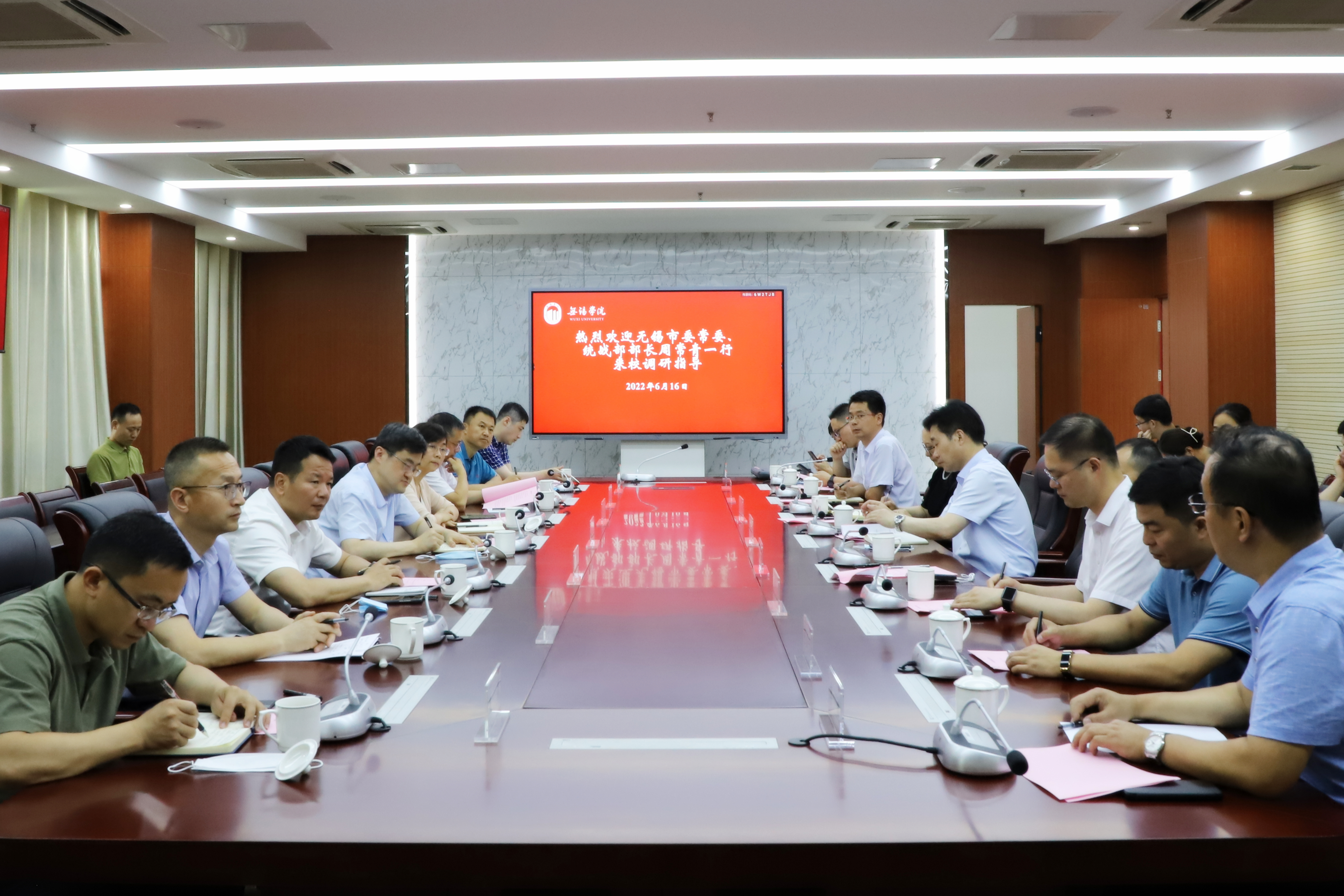 6月16日下午,无锡市委常委、统战部部长周常青,市委统战部常务副部长金卓青,市侨联主席李涛等一行来我校调研。校党委书记杨建新、党委副书记匡辉、副校长梁惠娥、相关职能部门负责人以及各民主党派代表人士陪同调研并参加座谈,会议由匡辉副书记主持。