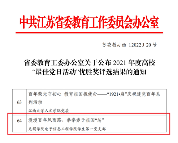 近日,江苏省委教育工委公布了2021年度高校“最佳党日活动”优胜奖评选结果,我校电子信息工程学院学生第一党支部《漫漫百年风雨路,拳拳赤子报国“芯“》荣获江苏省2021年度高校“最佳党日活动”优胜奖。
