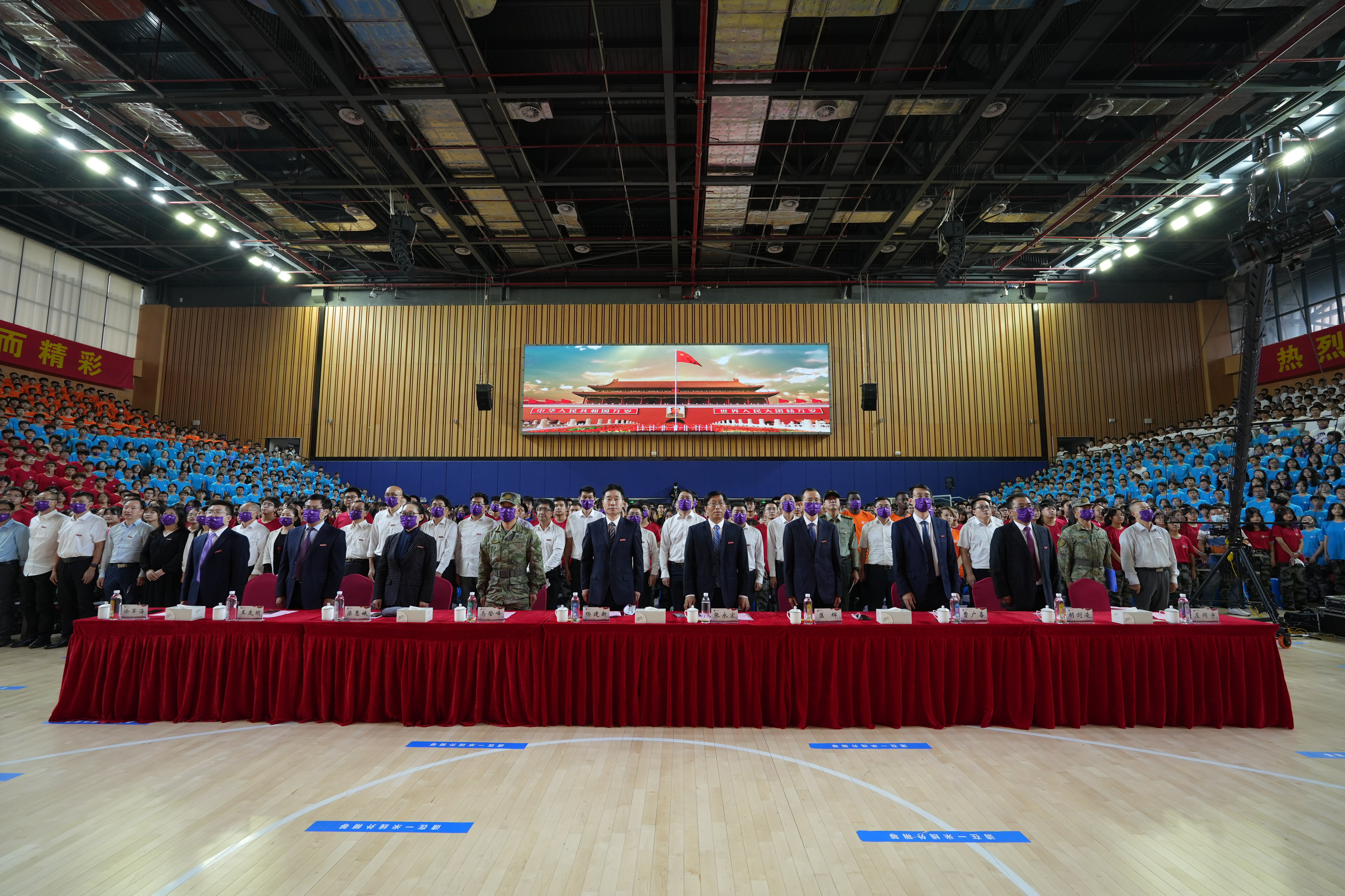 金秋九月,丹桂飘香的校园敞开了怀抱,迎接自五湖四海奔赴而来的2022级新同学。现场大屏播放的学校宣传片和迎新视频,表现出学校对新生到来的无限期待。一句“五星红旗,你是我的骄傲”,一首由学生深情合唱的《红旗飘飘》,点亮了青年学生理想的灯塔。伴随着庄严的升国旗仪式,开学典礼在雄壮的国歌声中拉开序幕。