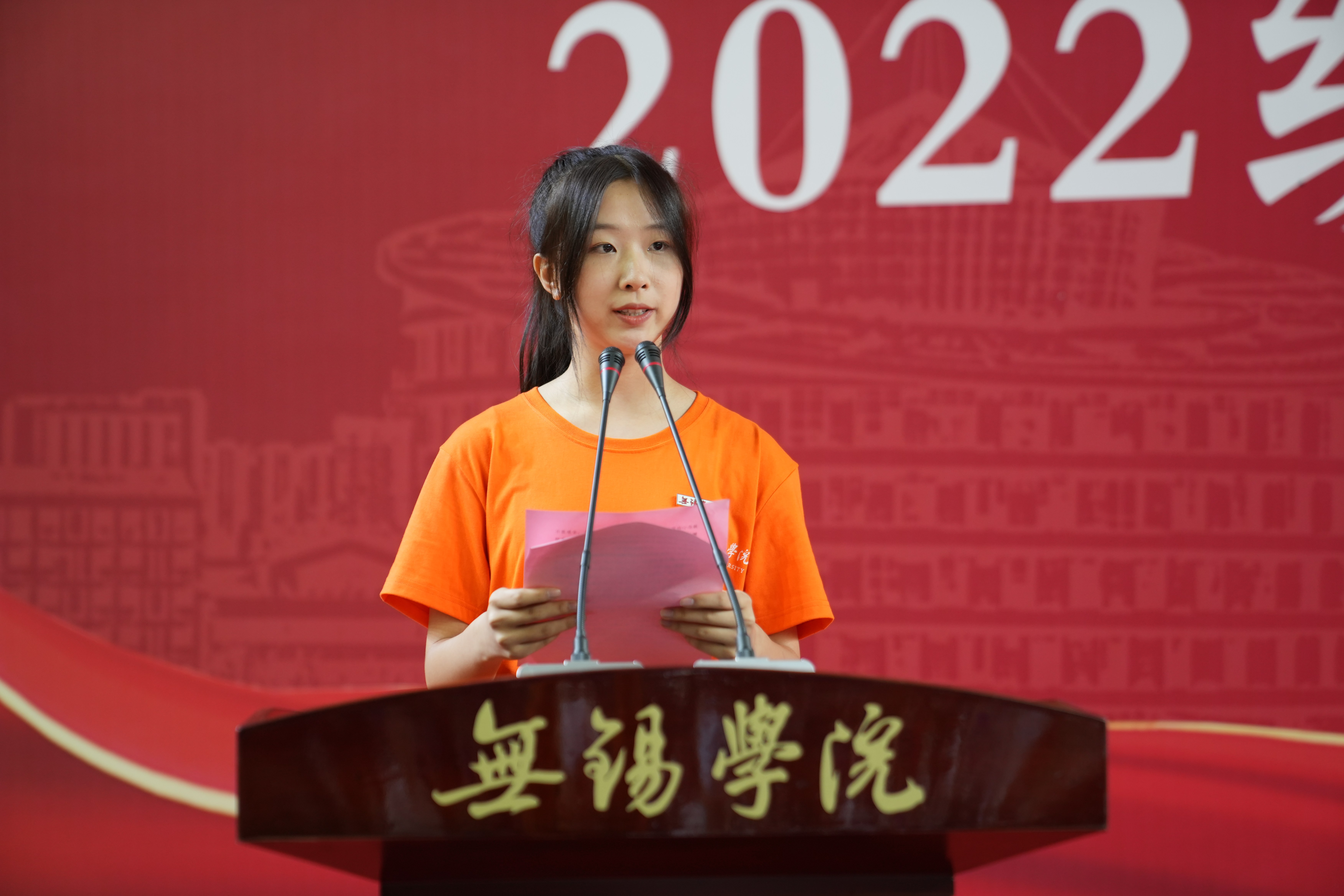 大气与遥感学院2022级新生方舒宁作为本科生新生代表发言。她表示在未来的日子里,将刻苦修炼崇高品德,培养独立精神、宽广胸怀,坚定政治意志,提高社会责任感,做“知行合一”的践行者,与无锡学院一起砥砺前行!