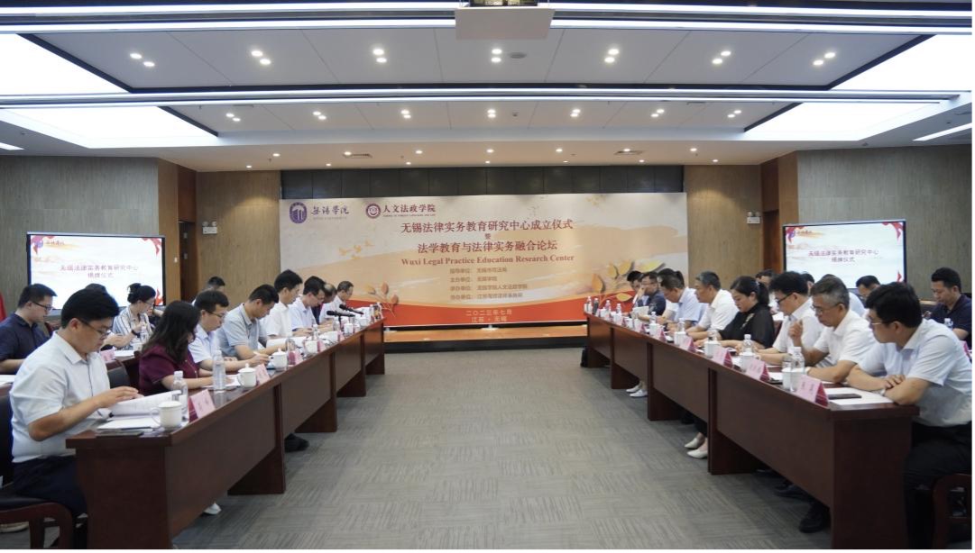 为深入学习贯彻习近平法治思想,落实中共中央办公厅、国务院办公厅《关于加强新时代法学教育和法学理论研究的意见》中关于推动法学教育与法治实务相互融合,法治工作部门加强实践资源、实践平台和实践机会供给,法治工作部门优秀实务专家到高等学校任教等具体要求,7月5日下午,无锡法律实务教育研究中心成立仪式暨法学教育与法律实务融合论坛在我校顺利举行。校党委书记杨建新,无锡市司法局党组成员、副局长杨军出席仪式并讲话,市司法局、市仲裁委员会领导,来自14家律师事务所和企业法务及风控部门共30余名嘉宾和领导,学校相关职能部门负责人和人文法政学院法律系教师代表共同参加仪式。仪式由副校长曹广喜主持。