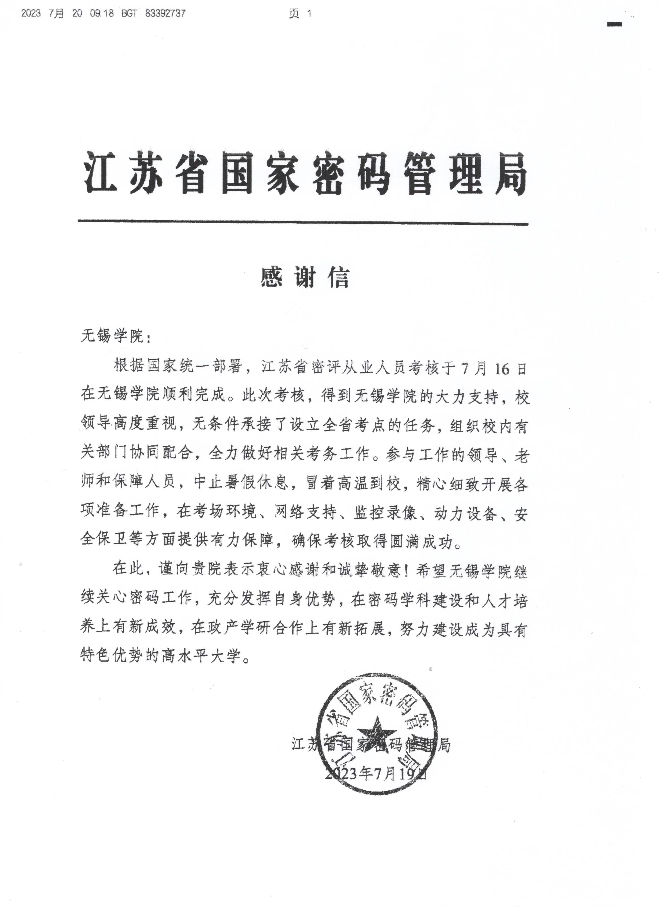 近日,江苏省国家密码管理局向我校发来感谢信,向我校对江苏省密评从业人员考核工作的重视和支持表示感谢。来信指出,此次考核得到无锡学院的大力支持,校内领导高度重视,无条件承接了设立全省考点的任务,组织校内有关部门协同配合,全力做好相关考务工作。参与工作的领导、老师和保障人员,中止暑假休息,冒着高温到校,精心细致开展各项准备工作,在考场环境、网络支持、监控录像、动力设备、安全保卫方面提供有力保障,确保考核取得圆满成功。江苏省国家密码管理局希望学校继续关心密码工作,充分发挥自身优势,在密码学科建设和人才培养上有新成效,在政产学研上有新拓展,努力建设成为具有特色优势的高水平大学。
