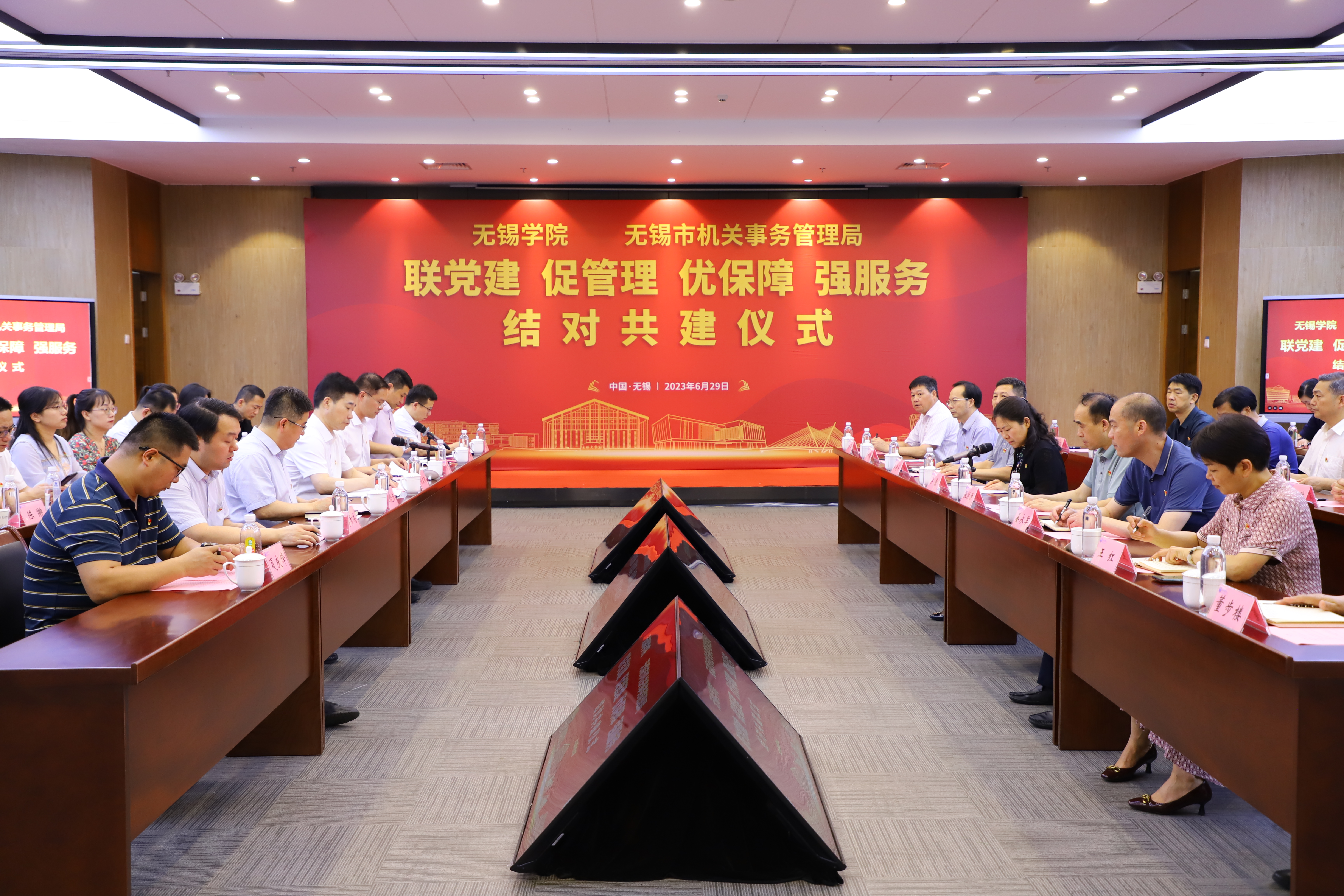 为深入学习宣传贯彻党的二十大精神和习近平新时代中国特色社会主义思想,进一步加强基层党建工作,激发基层党组织活力,创新党建工作载体,6月29日,我校与无锡市机关事务管理局开展党建联盟共建活动,无锡市机关事务管理局党组书记、局长宗翡,党组成员、副局长张牧原、吴海军、姜永军,相关职能处室领导,我校党委书记杨建新,副校长左同宇,机关党总支各支部书记、委员以及全体党员参加活动。会议由左同宇主持。