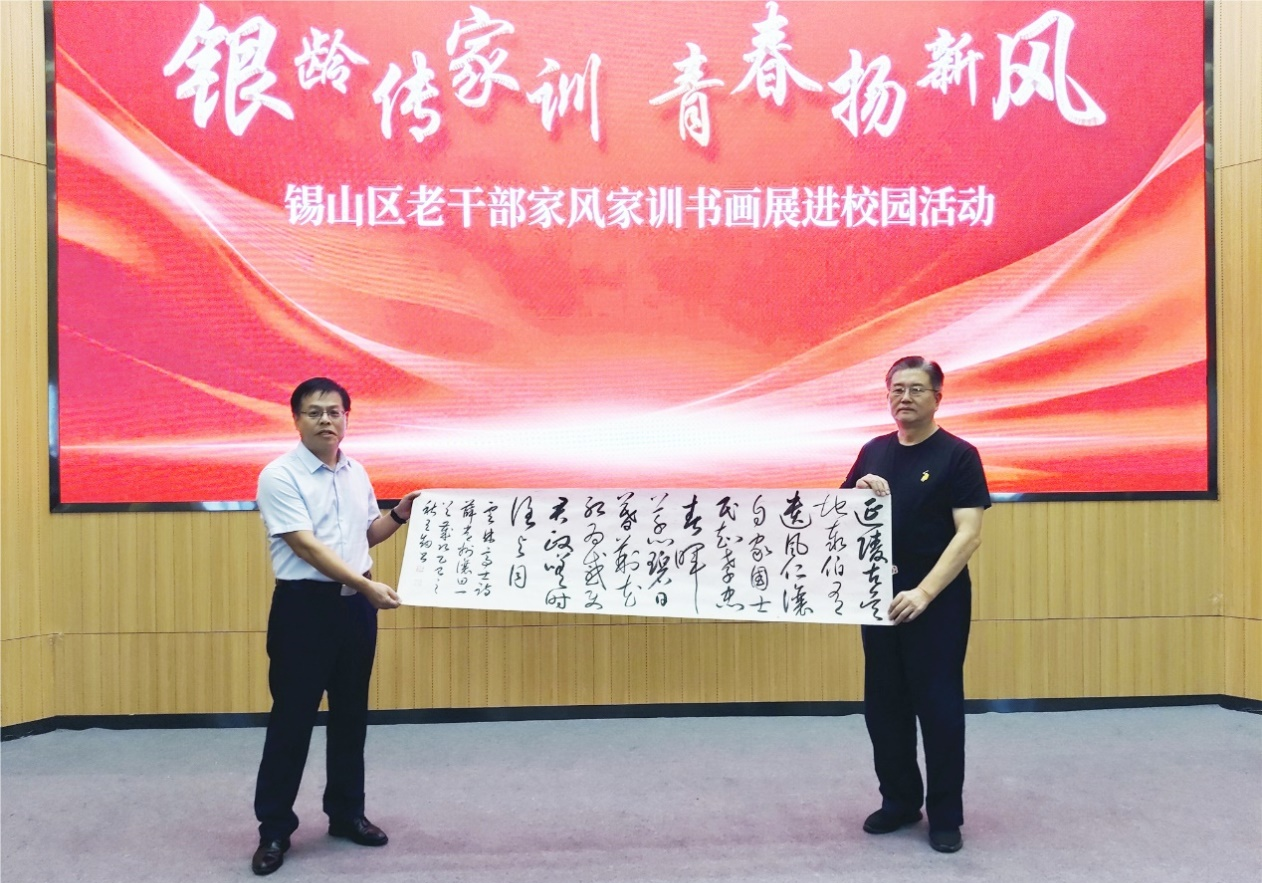为弘扬中华优秀家风文化,推动家风家训建设与高校思政教育深度融合,9月24日下午,我校纪委办公室、团委联合锡山区委老干部局共同举办“银龄传家训 青春扬新风”——锡山区老干部家风家训书画展进校园活动。校纪委书记王友明、无锡市委老干部局副局长胡泽服出席活动,市、区相关部门领导,“锡阳红”老干部书画社、区老年书画协会代表,学校相关职能部门负责人和师生代表参加活动。